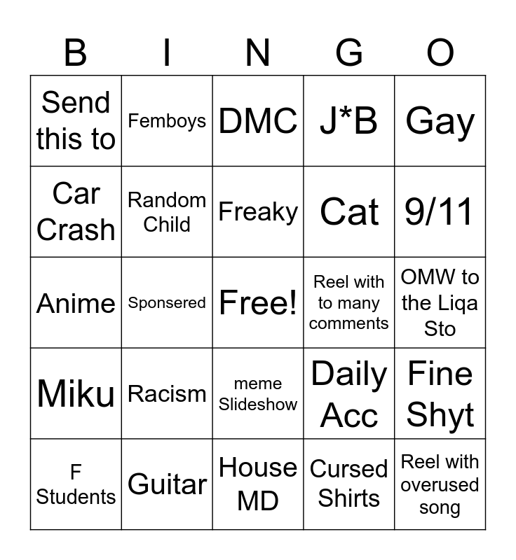 This bingo card has a free space and 24 words: Racism, Guitar, Freaky, F Students, Gay, Send this to, Car Crash, Femboys, Reel with to many comments, meme Slideshow, Cat, Anime, Daily Acc, Fine Shyt, Random Child, Cursed Shirts, OMW to the Liqa Sto, DMC, 9/11, Sponsered, Reel with overused song, Miku, J*B and House MD.