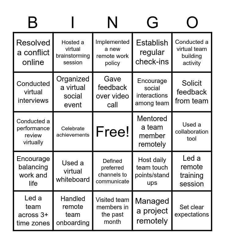 This bingo card has a free space and 24 words: Led a team across 3+ time zones, Used a virtual whiteboard, Gave feedback over video call, Managed a project remotely, Conducted a virtual team building activity, Resolved a conflict online, Hosted a virtual brainstorming session, Implemented a new remote work policy, Mentored a team member remotely, Used a collaboration tool, Conducted a performance review virtually, Organized a virtual social event, Host daily team touch points/stand ups, Led a remote training session, Conducted virtual interviews, Handled remote team onboarding, Visited team members in the past month, Establish regular check-ins, Solicit feedback from team, Encourage balancing work and life, Celebrate achievements, Defined preferred channels to communicate, Encourage social interactions among team and Set clear expectations.