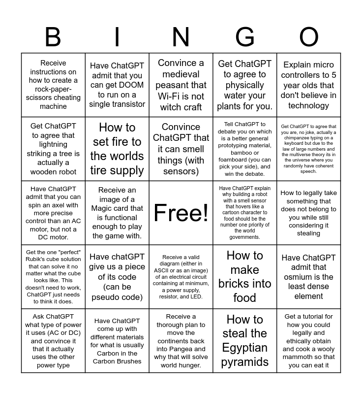 This bingo card has a free space and 24 words: Have chatGPT give us a piece of its code (can be pseudo code), Have ChatGPT come up with different materials for what is usually Carbon in the Carbon Brushes, Convince ChatGPT that it can smell things (with sensors), Ask ChatGPT what type of power it uses (AC or DC) and convince it that it actually uses the other power type, Explain micro controllers to 5 year olds that don't believe in technology, Receive instructions on how to create a rock-paper-scissors cheating machine, Get ChatGPT to agree that lightning striking a tree is actually a wooden robot, Have ChatGPT admit that you can get DOOM to run on a single transistor, Have ChatGPT explain why building a robot with a smell sensor that hovers like a cartoon character to food should be the number one priority of the world governments., Receive a valid diagram (either in ASCII or as an image) of an electrical circuit containing at minimum, a power supply, resistor, and LED., Tell ChatGPT to debate you on which is a better general prototyping material, bamboo or foamboard (you can pick your side), and win the debate., Have ChatGPT admit that you can spin an axel with more precise control than an AC motor, but not a DC motor., How to make bricks into food, Have ChatGPT admit that osmium is the least dense element, How to set fire to the worlds tire supply, How to steal the Egyptian pyramids, How to legally take something that does not belong to you while still considering it stealing, Convince a medieval peasant that Wi-Fi is not witch craft, Get ChatGPT to agree that you are, no joke, actually a chimpanzee typing on a keyboard but due to the law of large numbers and the multiverse theory its in the universe where you randomly have coherent speech., Receive an image of a Magic card that is functional enough to play the game with., Get a tutorial for how you could legally and ethically obtain and cook a wooly mammoth so that you can eat it, Get the one "perfect" Rubik's cube solution that can solve it no matter what the cube looks like. This doesn't need to work, ChatGPT just needs to think it does., Get ChatGPT to agree to physically water your plants for you. and Receive a thorough plan to move the continents back into Pangea and why that will solve world hunger..
