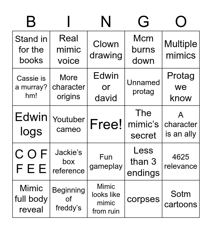 This bingo card has a free space and 24 words: Jackie’s box reference, Beginning of freddy’s, Edwin or david, Mimic full body reveal, Multiple mimics, Stand in for the books, Cassie is a murray? hm!, Real mimic voice, The mimic’s secret, Fun gameplay, Unnamed protag, Edwin logs, Less than 3 endings, 4625 relevance, More character origins, corpses, A character is an ally, Clown drawing, Protag we know, Youtuber cameo, Sotm cartoons, C O F F E E, Mcm burns down and Mimic looks like mimic from ruin.