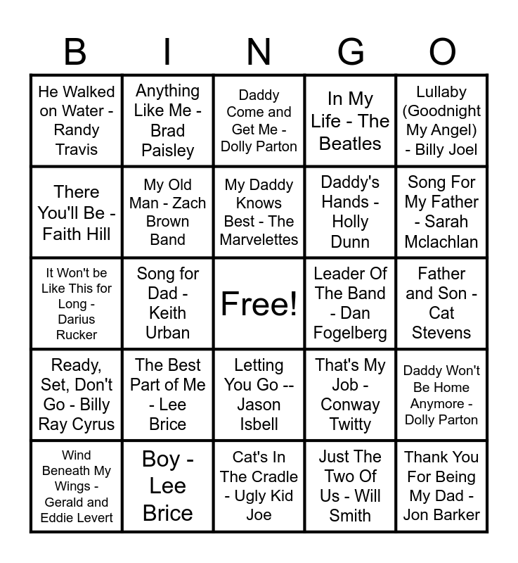This bingo card has a free space and 74 words: My Father's Eyes - Eric Clapton, My Little Girl - Tim McGraw, My Daddy Knows Best - The Marvelettes, They Don't Make Em Like My Daddy Anymore - Loretta Lynn, Daddy's Little Girl - Michael Buble, Daddy Lessons - Beyonce and The Chicks, Butterfly Kisses- Robert Carlisle, I Don't Want to Miss a Thing - Aerosmith, Mr. Mom - Lonestar, The Box - Randy Travis, Wind Beneath My Wings - Gerald and Eddie Levert, The Best Day - George Straight, Daddy's Hands - Holly Dunn, Lullaby (Goodnight My Angel) - Billy Joel, Ready, Set, Don't Go - Billy Ray Cyrus, Boy - Lee Brice, Daughters - John Mayer, Leader Of The Band - Dan Fogelberg, God Only Knows - The Beach Boys, He Walked on Water - Randy Travis, Song for Dad - Keith Urban, Daddy Come and Get Me - Dolly Parton, In My Life - The Beatles, Father and Son - Cat Stevens, There You'll Be - Faith Hill, Color Him Father - The Winstons, Daddy Don't You Walk So Fast - Wayne Newton, Hands Of A Working Man - Ty Herndon, Love Without End, Amen - George Straight, They Don't Make Em Like My Daddy Anymore - Loretta Lynn, My Old Man - Zach Brown Band, Dance With My Father -Luther Vandross, Father To Son - Queen, Daddy's Little Girl - The Shires, Unforgettable - Nat King Cole and Natalie Cole, Watching You - Rodney Atkins, You Can Let Go - Crystal Shawanda, Letter 2 My Unborn - 2Pac, Thank You For Being My Dad - Jon Barker, Your Joy - Chrisette Michele, My Wish - Rascal Flatts, Letting You Go -- Jason Isbell, My Daddy Knows Best - The Marvelettes, Not All Heroes Wear Capes - Owl City, Daughters - John Mayer, Anything Like Me -Brad Paisley, My Daddy - Davy Jones, Daddy Could Swear, I Declare - Gladys Knight and The Pips, Life Of A Salesman - Yellowcard, Daddy's Hands - Holly Dunn, Tough Little Boys - Gary Allen, The Greatest Man I Never Knew-Reba McEntire, That's My Job - Conway Twitty, Cleaning This Gun (Come On In Boy) - Rodney Atkins, Father and Daughter - Paul Simon, Family Man - Craig Campbell, Cat's In The Cradle - Ugly Kid Joe, Lullaby (Goodnight My Angel) - Billy Joel, I'm Already There - Lonestar, Ready, Set, Don't Go - Billy Ray Cyrus, The Best Part of Me - Lee Brice, Father's Love - Bob Carlisle, Just The Two Of Us - Will Smith, Daddy Won't Be Home Anymore - Dolly Parton, It Won't be Like This for Long - Darius Rucker, There Goes My Life - Kenny Chesney, I Don't Call Him Daddy - Doug Supernaw, Just Fishin' - Trace Adkins, Song For My Father - Sarah Mclachlan, Daddy Come and Get Me - Dolly Parton, He Didn't Have to Be - Brad Paisley, My Son Calls Another Man Daddy - Hank Williams, Papa's Got A Brand New Bag - James Brown and Daddy Doesn't Pray Anymore - Chris Stapleton.