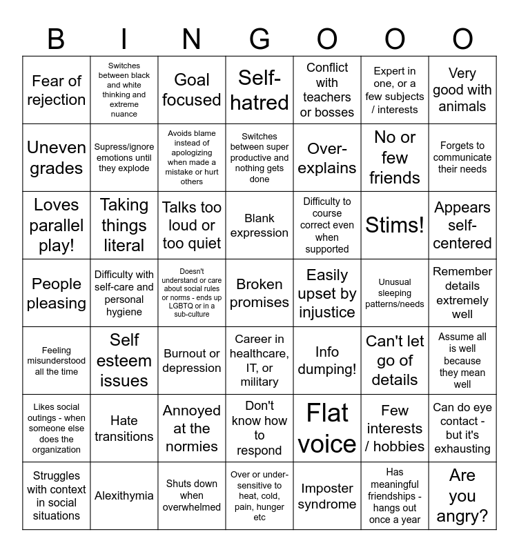 This bingo card has a free space and 48 words: Flat voice, No or few friends, Over or under-sensitive to heat, cold, pain, hunger etc, Difficulty with self-care and personal hygiene, Talks too loud or too quiet, Remember details extremely well, Switches between black and white thinking and extreme nuance, Alexithymia, Expert in one, or a few subjects / interests, Career in healthcare, IT, or military, Very good with animals, Self-hatred, Stims!, Difficulty to course correct even when supported, Likes social outings - when someone else does the organization, Unusual sleeping patterns/needs, Uneven grades, Forgets to communicate their needs, Few interests / hobbies, Conflict with teachers or bosses, Over-explains, Doesn't understand or care about social rules or norms - ends up LGBTQ or in a sub-culture, Fear of rejection, Supress/ignore emotions until they explode, Can do eye contact - but it's exhausting, Avoids blame instead of apologizing when made a mistake or hurt others, Appears self-centered, Struggles with context in social situations, Blank expression, Taking things literal, Has meaningful friendships - hangs out once a year, Easily upset by injustice, Assume all is well because they mean well, Hate transitions, People pleasing, Info dumping!, Can't let go of details, Loves parallel play!, Burnout or depression, Annoyed at the normies, Feeling misunderstood all the time, Are you angry?, Goal focused, Shuts down when overwhelmed, Switches between super productive and nothing gets done, Don't know how to respond, Self esteem issues and Imposter syndrome.