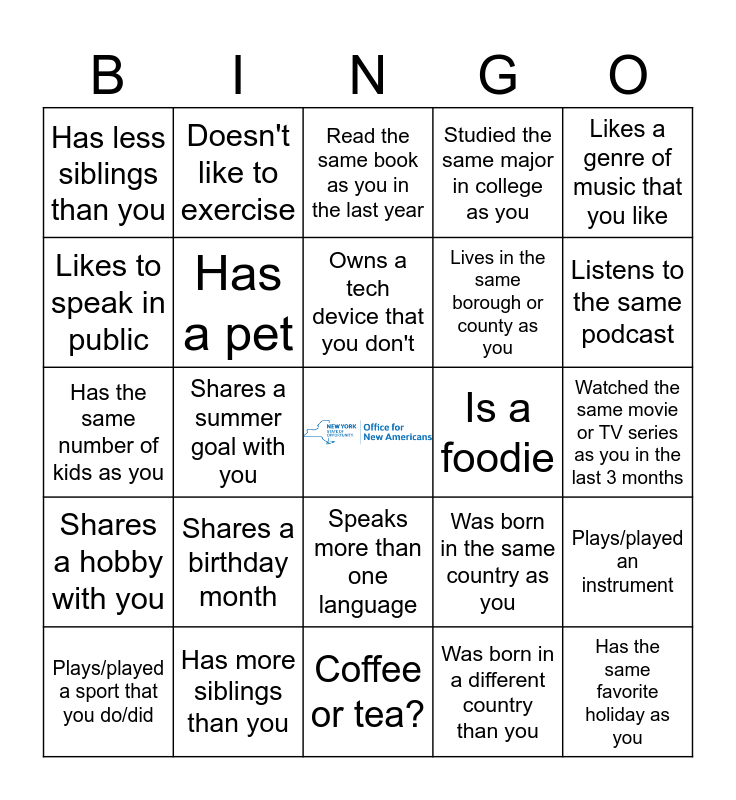 This bingo card has a free space and 24 words: Shares a birthday month, Has more siblings than you, Owns a tech device that you don't, Plays/played a sport that you do/did, Likes a genre of music that you like, Has less siblings than you, Likes to speak in public, Doesn't like to exercise, Is a foodie, Speaks more than one language, Lives in the same borough or county as you, Has the same number of kids as you, Was born in the same country as you, Plays/played an instrument, Has a pet, Was born in a different country than you, Watched the same movie or TV series as you in the last 3 months, Read the same book as you in the last year, Listens to the same podcast, Shares a summer goal with you, Has the same favorite holiday as you, Shares a hobby with you, Studied the same major in college as you and Coffee or tea?.