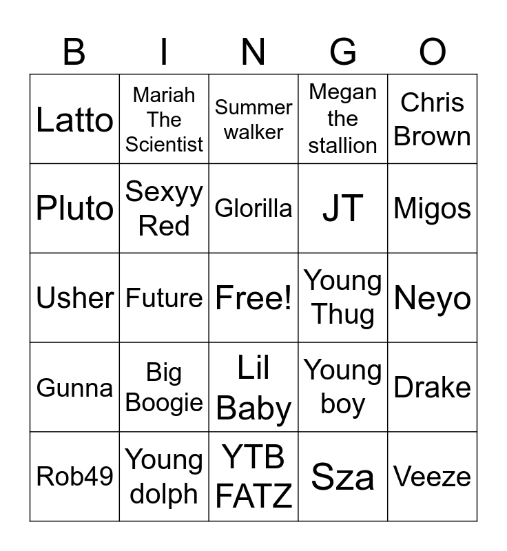 This bingo card has a free space and 24 words: Big Boogie, Young dolph, Glorilla, Rob49, Chris Brown, Latto, Pluto, Mariah The Scientist, Young Thug, Lil Baby, JT, Usher, Young boy, Drake, Sexyy Red, Sza, Neyo, Summer walker, Migos, Future, Veeze, Gunna, Megan the stallion and YTB FATZ.