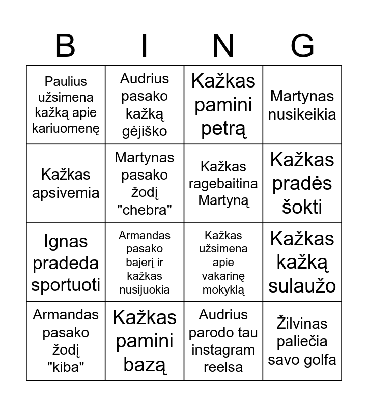 This bingo card has 16 words: Kažkas pamini bazą, Kažkas kažką sulaužo, Kažkas pamini petrą, Paulius užsimena kažką apie kariuomenę, Ignas pradeda sportuoti, Audrius pasako kažką gėjiško, Kažkas užsimena apie vakarinę mokyklą, Audrius parodo tau instagram reelsa, Kažkas apsivemia, Martynas pasako žodį "chebra", Armandas pasako žodį "kiba", Martynas nusikeikia, Armandas pasako bajerį ir kažkas nusijuokia, Kažkas pradės šokti, Kažkas ragebaitina Martyną and Žilvinas paliečia savo golfa.