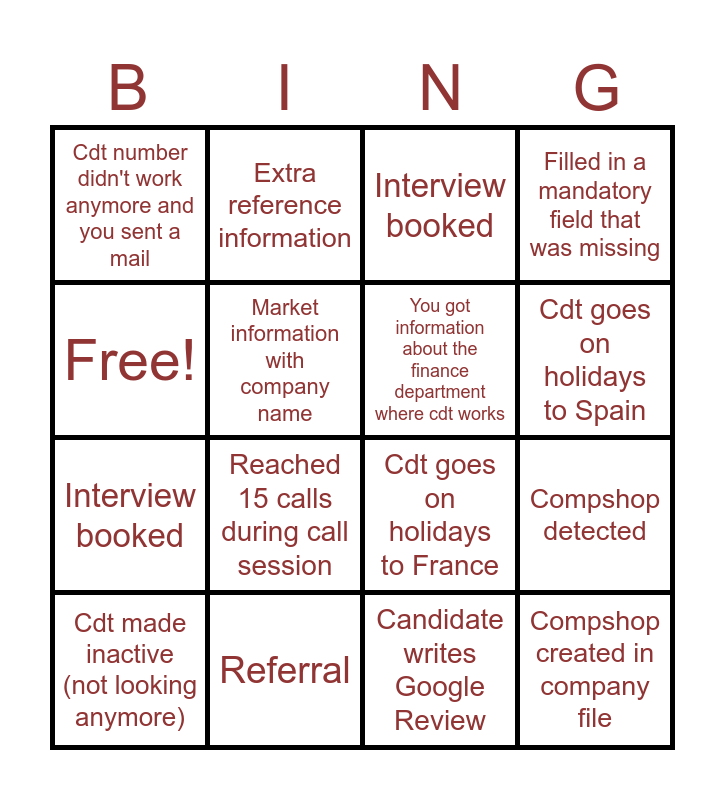This bingo card has 16 words: Referral, Compshop detected, Interview booked, Cdt number didn't work anymore and you sent a mail, Interview booked, Extra reference information, Cdt goes on holidays to France, Candidate writes Google Review, Free!, Market information with company name, Cdt made inactive (not looking anymore), Filled in a mandatory field that was missing, Reached 15 calls during call session, Cdt goes on holidays to Spain, You got information about the finance department where cdt works and Compshop created in company file.
