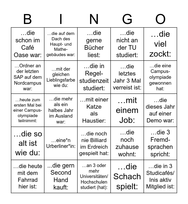 This bingo card has 25 words: …eine*n Urberliner*in:, …an 3 oder mehr Universitäten/ Hochschulen studiert (hat):, …die in Regel-studienzeit studiert:, …die heute mit dem Fahrrad hier ist:, …die viel zockt:, …die schon im Café Oase war:, …Ordner an der letzten SAP auf dem Nordcampus war:, …die auf dem Dach des Haupt- und Mathe-gebäudes war:, …mit einem Job:, …die noch nie Billiard im Erdreich gespielt hat:, …die letztes Jahr 3 Mal verreist ist:, …heute zum ersten Mal bei einer Campus-olympiade teilnimmt:, …die noch zuhause wohnt:, …die 3 Fremd-sprachen spricht:, …mit der gleichen Lieblingsfarbe wie du:, …die in 3 Studicafés/ Inis aktiv Mitglied ist:, …die dieses Jahr auf einer Demo war:, …die gerne Bücher liest:, …die eine Campus-olympiade gewonnen hat:, …die mehr als ein halbes Jahr im Ausland war:, …mit einer Katze als Haustier:, ...die gern Second Hand kauft:, …die so alt ist wie du:, …die nicht an der TU studiert: and …die Schach spielt:.