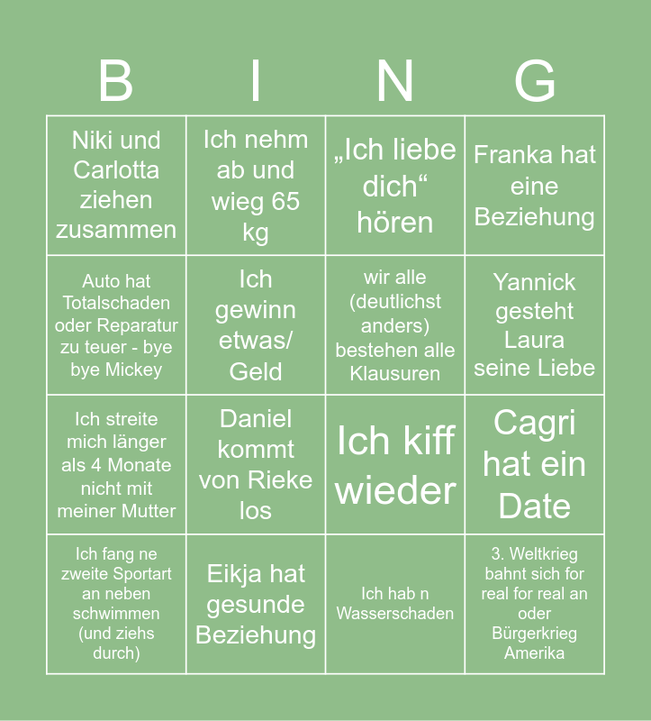 This bingo card has 16 words: Eikja hat gesunde Beziehung, Cagri hat ein Date, „Ich liebe dich“ hören, Niki und Carlotta ziehen zusammen, Ich streite mich länger als 4 Monate nicht mit meiner Mutter, Ich nehm ab und wieg 65 kg, Ich kiff wieder, Ich hab n Wasserschaden, Auto hat Totalschaden oder Reparatur zu teuer - bye bye Mickey, Ich gewinn etwas/ Geld, Ich fang ne zweite Sportart an neben schwimmen (und ziehs durch), Franka hat eine Beziehung, Daniel kommt von Rieke los, Yannick gesteht Laura seine Liebe, wir alle (deutlichst anders) bestehen alle Klausuren and 3. Weltkrieg bahnt sich for real for real an oder Bürgerkrieg Amerika.