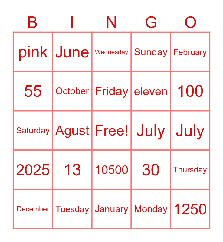 This bingo card has a free space and 24 words: 13, Tuesday, Friday, December, February, pink, 55, June, July, 10500, eleven, Saturday, 30, Thursday, October, Monday, July, Wednesday, 100, Agust, 1250, 2025, Sunday and January.