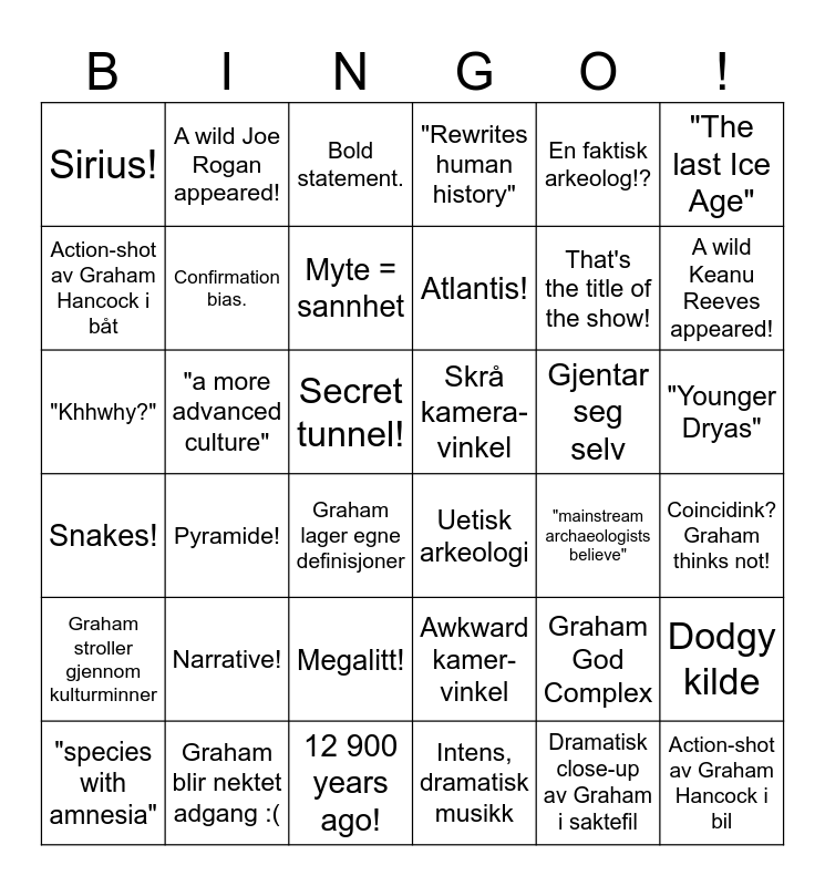 This bingo card has 36 words: Awkward kamer-vinkel, Megalitt!, Intens, dramatisk musikk, Action-shot av Graham Hancock i båt, Snakes!, Skrå kamera-vinkel, Confirmation bias., 12 900 years ago!, En faktisk arkeolog!?, Graham God Complex, A wild Keanu Reeves appeared!, "Rewrites human history", Dodgy kilde, "a more advanced culture", Atlantis!, Sirius!, Graham stroller gjennom kulturminner, Gjentar seg selv, "Khhwhy?", Bold statement., Secret tunnel!, Pyramide!, Uetisk arkeologi, Graham lager egne definisjoner, "mainstream archaeologists believe", A wild Joe Rogan appeared!, That's the title of the show!, Graham blir nektet adgang :(, Myte = sannhet, "The last Ice Age", Action-shot av Graham Hancock i bil, "species with amnesia", Coincidink? Graham thinks not!, "Younger Dryas", Narrative! and Dramatisk close-up av Graham i saktefil.