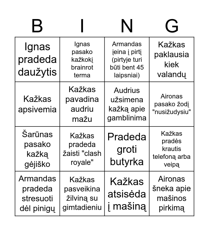 This bingo card has 16 words: Kažkas pasveikina žilviną su gimtadieniu, Kažkas pradės krautis telefoną arba veipą, Armandas įeina į pirtį (pirtyje turi būti bent 45 laipsniai), Ignas pradeda daužytis, Šarūnas pasako kažką gėjiško, Ignas pasako kažkokį brainrot terma, Pradeda groti butyrka, Kažkas atsisėda į mašiną, Kažkas apsivemia, Kažkas pavadina audriu mažu, Armandas pradeda stresuoti dėl pinigų, Kažkas paklausia kiek valandų, Kažkas pradeda žaisti "clash royale", Aironas pasako žodį "nusižudysiu", Audrius užsimena kažką apie gamblinima and Aironas šneka apie mašinos pirkimą.