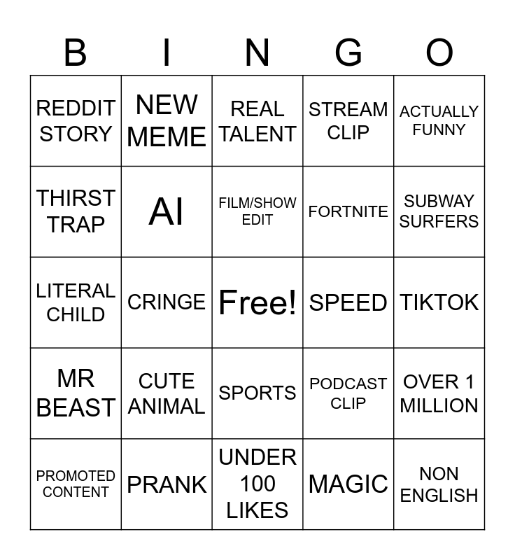 This bingo card has a free space and 25 words: CUTE ANIMAL, UNDER 100 LIKES, FILM/SHOW EDIT, PROMOTED CONTENT, ACTUALLY FUNNY, REDDIT STORY, THIRST TRAP, NEW MEME, SPEED, SPORTS, FORTNITE, LITERAL CHILD, PODCAST CLIP, OVER 1 MILLION, AI, BRAIN ROT, TIKTOK, REAL TALENT, SUBWAY SURFERS, CRINGE, NON ENGLISH, PRANK, MR BEAST, STREAM CLIP and MAGIC.