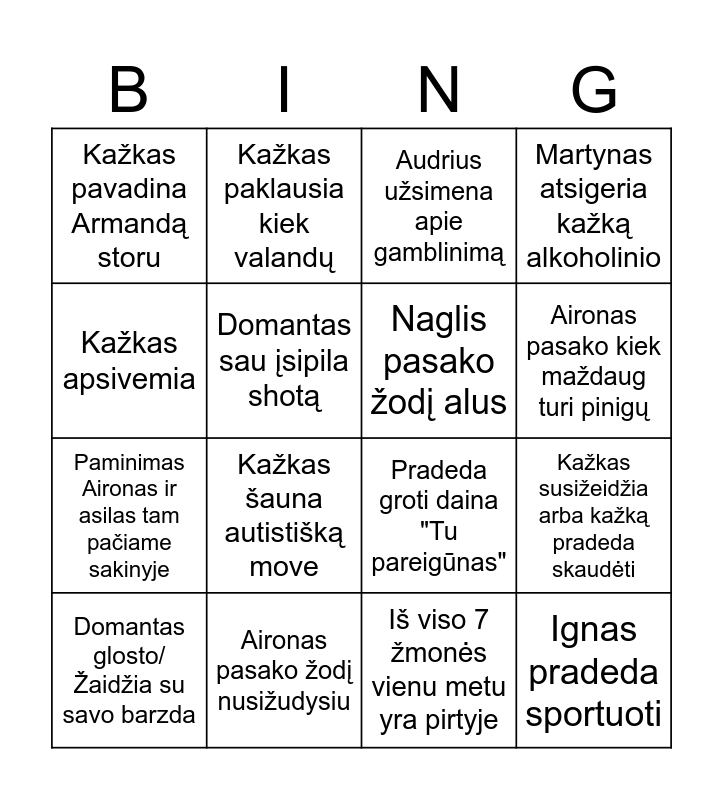 This bingo card has 16 words: Aironas pasako žodį nusižudysiu, Kažkas susižeidžia arba kažką pradeda skaudėti, Audrius užsimena apie gamblinimą, Kažkas pavadina Armandą storu, Paminimas Aironas ir asilas tam pačiame sakinyje, Kažkas paklausia kiek valandų, Pradeda groti daina "Tu pareigūnas", Iš viso 7 žmonės vienu metu yra pirtyje, Kažkas apsivemia, Domantas sau įsipila shotą, Domantas glosto/Žaidžia su savo barzda, Martynas atsigeria kažką alkoholinio, Kažkas šauna autistišką move, Aironas pasako kiek maždaug turi pinigų, Naglis pasako žodį alus and Ignas pradeda sportuoti.
