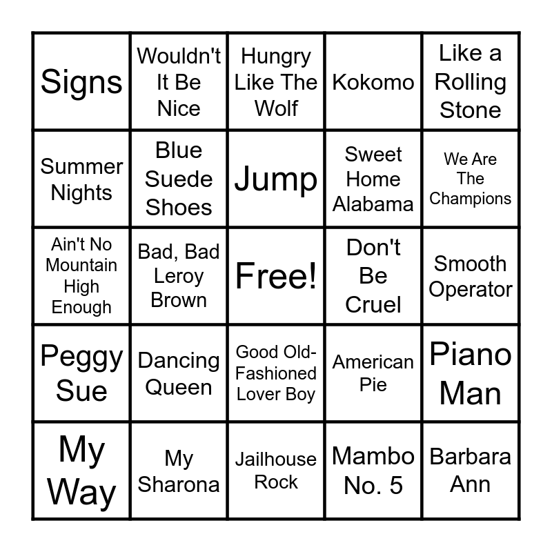 This bingo card has a free space and 50 words: Love Potion No. 9, Barbara Ann, Stayin Alive, Jailhouse Rock, Dancing Queen, I Want To Hold Your Hand, Wouldn't It Be Nice, Hey Jude, Summer Nights, Good Vibrations, Blue Suede Shoes, Kokomo, Piano Man, American Pie, Goodbye Yellow Brick Road, I'm Still Standing, Jump, Don't Be Cruel, Burning Love, Like a Rolling Stone, Bad, Bad Leroy Brown, Mambo No. 5, Signs, Sweet Home Alabama, Free Bird, We Will Rock You, We Are The Champions, The Devil Went Down To Georgia, Hungry Like The Wolf, Good Old-Fashioned Lover Boy, California Dreamin', Rocket Man, Love Shack, Rock Lobster, My Sharona, Lola, Cheeseburger in Paradise, Tequila, Margaritaville, Smooth Operator, Are You Lonesome Tonight?, Sweet Caroline, The Twist, Twist and Shout, My Way, Ain't No Mountain High Enough, L-O-V-E, We Belong Together, Peggy Sue and Hound Dog.