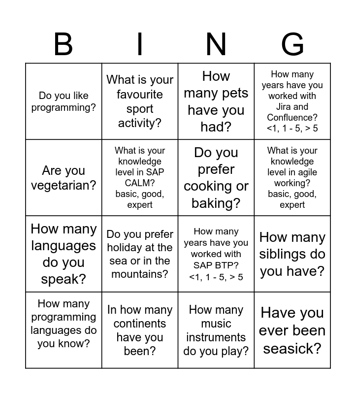 This bingo card has 16 words: In how many continents have you been?, How many siblings do you have?, How many pets have you had?, Do you like programming?, How many languages do you speak?, What is your favourite sport activity?, How many years have you worked with SAP BTP? <1, 1 - 5, > 5, How many music instruments do you play?, Are you vegetarian?, What is your knowledge level in SAP CALM? basic, good, expert, How many programming languages do you know?, How many years have you worked with Jira and Confluence? <1, 1 - 5, > 5, Do you prefer holiday at the sea or in the mountains?, What is your knowledge level in agile working? basic, good, expert, Do you prefer cooking or baking? and Have you ever been seasick?.