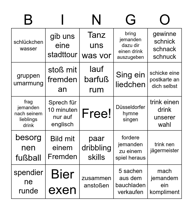 This bingo card has a free space and 24 words: Bild mit einem Fremden, Bier exen, lauf barfuß rum, spendier ne runde, gewinne schnick schnack schnuck, schlückchen wasser, gruppen umarmung, gib uns eine stadttour, Düsseldorfer hymne singen, paar dribbling skills, Sing ein liedchen, frag jemanden nach seinem lieblings drink, fordere jemanden zu einem spiel heraus, trink nen jägermeister, stoß mit fremden an, 5 sachen aus dem bauchladen verkaufen, trink einen drink unserer wahl, Tanz uns was vor, schicke eine postkarte an dich selbst, Sprech für 10 minuten nur auf englisch, mach jemandem ein kompliment, besorg nen fußball, bring jemanden dazu dir einen drink auszugeben and zusammen anstoßen.