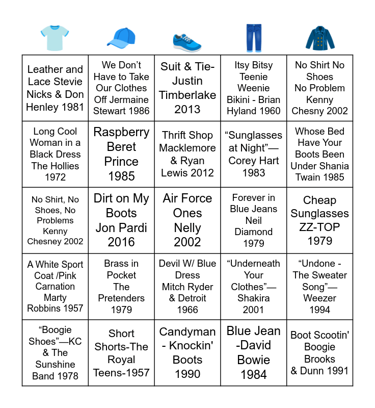 This bingo card has 35 words: Sharp Dressed Man ZZ Top 1983, Blue Suede Shoes Elvis Presley 1956, These Boots Are Made for Walkin’ Nancy Sinatra 1966, Raspberry Beret Prince 1985, Devil W/ Blue Dress Mitch Ryder & Detroit 1966, Itsy Bitsy Teenie Weenie Bikini - Brian Hyland 1960, Long Cool Woman in a Black Dress The Hollies 1972, Fashion David Bowie 1980, Thrift Shop Macklemore & Ryan Lewis 2012, Short Skirt/Long Jacket Cake 2001, No Shirt, No Shoes, No Problems Kenny Chesney 2002, No Shirt No Shoes No Problem Kenny Chesny 2002, Zoot Suit Riot Cherry Poppin' Daddies 1997, Jeans On David Dundas 1976, Leather and Lace Stevie Nicks & Don Henley 1981, Forever in Blue Jeans Neil Diamond 1979, Blue Jean -David Bowie 1984, Dirt on My Boots Jon Pardi 2016, A White Sport Coat /Pink Carnation Marty Robbins 1957, Air Force Ones Nelly 2002, “Underneath Your Clothes”—Shakira 2001, “Boogie Shoes”—KC & The Sunshine Band 1978, “Undone - The Sweater Song”—Weezer 1994, Short Shorts-The Royal Teens-1957, Suit & Tie- Justin Timberlake 2013, Whose Bed Have Your Boots Been Under Shania Twain 1985, Boot Scootin' Boogie Brooks & Dunn 1991, Goody Two Shoes -Adam Ant 1982, “Sunglasses at Night”—Corey Hart 1983, Cheap Sunglasses ZZ-TOP 1979, I Got Ants in My Pants James Brown 1973, Candyman - Knockin' Boots 1990, Brass in Pocket The Pretenders 1979, We Don’t Have to Take Our Clothes Off Jermaine Stewart 1986 and Dress you up- Madonna 1985.