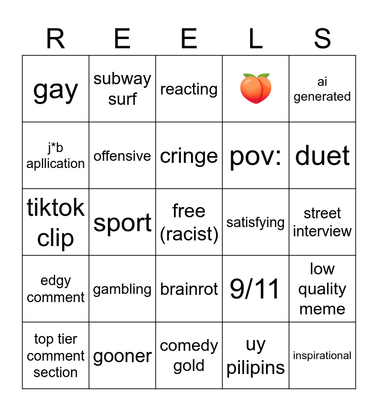 This bingo card has a free space and 24 words: gambling, gooner, cringe, top tier comment section, ai generated, gay, j*b apllication, subway surf, satisfying, brainrot, pov:, tiktok clip, 9/11, low quality meme, offensive, uy pilipins, street interview, reacting, duet, sport, inspirational, edgy comment, 🍑 and comedy gold.