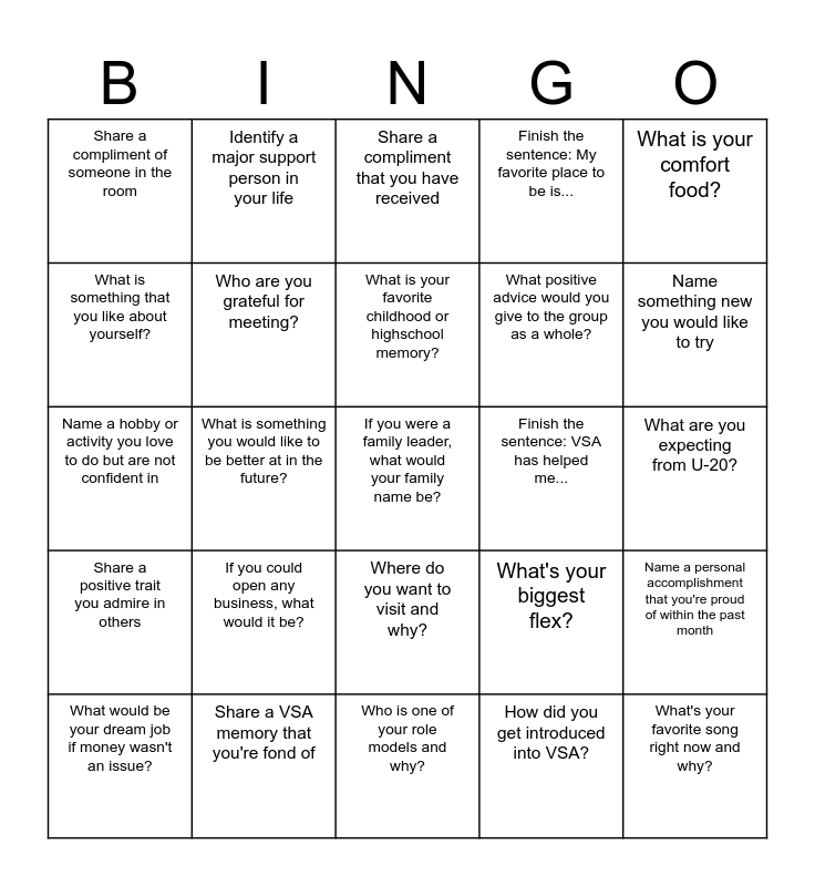 This bingo card has a free space and 24 words: If you could open any business, what would it be?, Share a VSA memory that you're fond of, What is your favorite childhood or highschool memory?, What would be your dream job if money wasn't an issue?, What is your comfort food?, Share a compliment of someone in the room, What is something that you like about yourself?, Identify a major support person in your life, Finish the sentence: VSA has helped me..., Where do you want to visit and why?, What positive advice would you give to the group as a whole?, Name a hobby or activity you love to do but are not confident in, What's your biggest flex?, Name a personal accomplishment that you're proud of within the past month, Who are you grateful for meeting?, How did you get introduced into VSA?, What are you expecting from U-20?, Share a compliment that you have received, Name something new you would like to try, What is something you would like to be better at in the future?, What's your favorite song right now and why?, Share a positive trait you admire in others, Finish the sentence: My favorite place to be is... and Who is one of your role models and why?.