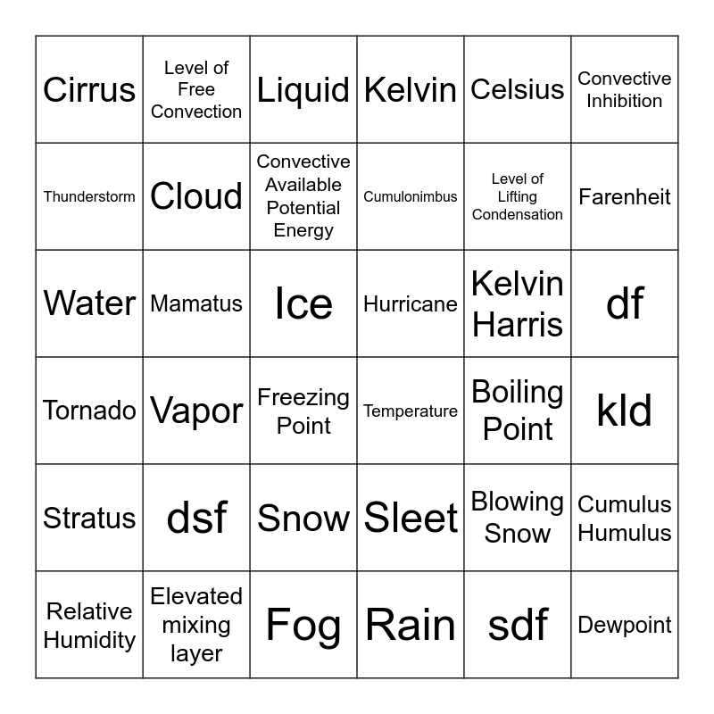 This bingo card has 36 words: Sleet, Snow, Rain, Thunderstorm, Tornado, Hurricane, Cloud, Fog, Celsius, Blowing Snow, Farenheit, Kelvin, Cumulus Humulus, Mamatus, Cumulonimbus, Cirrus, Stratus, Kelvin Harris, Water, Liquid, Ice, Vapor, Temperature, Freezing Point, Boiling Point, Level of Free Convection, Level of Lifting Condensation, Elevated mixing layer, Convective Available Potential Energy, Convective Inhibition, Dewpoint, Relative Humidity, kld, df, dsf and sdf.