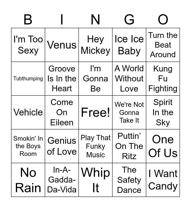 This bingo card has a free space and 30 words: In-A-Gadda-Da-Vida, Tainted Lov, Come On Eileen, Macarena, I'm Too Sexy, Hey Mickey, Groove Is In the Heart, Play That Funky Music, We're Not Gonna Take It, Whip It, Spirit In the Sky, I Want Candy, The Safety Dance, Electric Avenue, Kung Fu Fighting, Mambo No. 5, Puttin’ On The Ritz, Smokin' In the Boys Room, Genius of Love, Turn the Beat Around, Vehicle, You Sexy Thing, Venus, A World Without Love, Tubthumping, Ice Ice Baby, One Of Us, No Rain, I'm Gonna Be and Heaven.