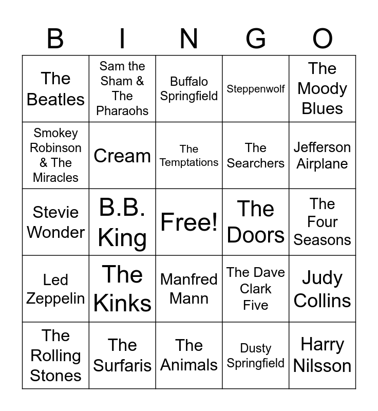 This bingo card has a free space and 31 words: The Animals, Aretha Franklin, B.B. King, The Beach Boys, The Beatles, Buffalo Springfield, Cream, The Dave Clark Five, The Doors, Dusty Springfield, The Four Seasons, Harry Nilsson, Herman's Hermits, The Hollies, Jefferson Airplane, Joe Cocker, Judy Collins, The Kinks, Led Zeppelin, Manfred Mann, The Moody Blues, Nancy Sinatra, The Rolling Stones, Sam the Sham & The Pharaohs, The Searchers, Smokey Robinson & The Miracles, Steppenwolf, Stevie Wonder, The Surfaris, The Temptations and The Who.