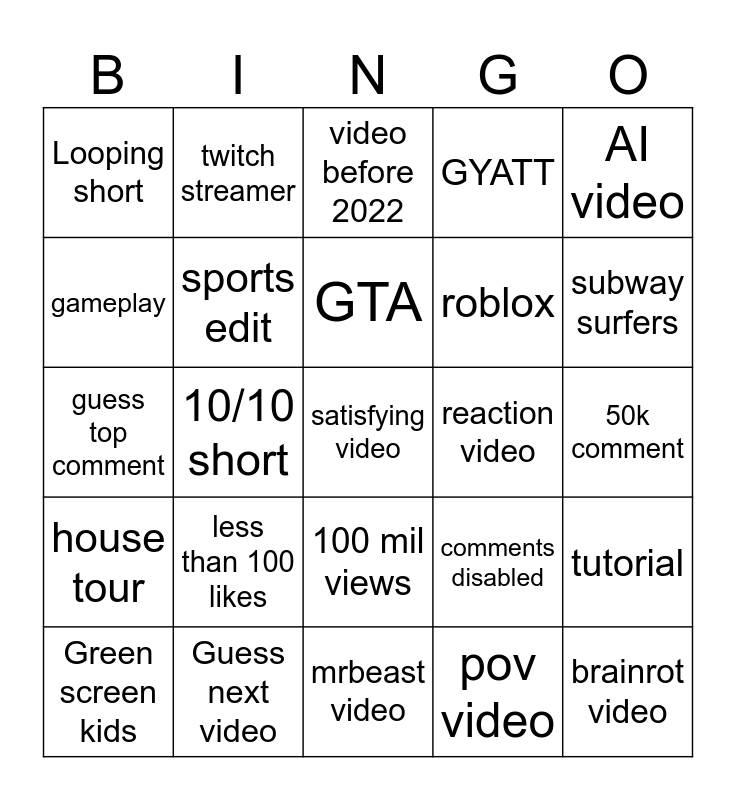 This bingo card has a free space and 24 words: less than 100 likes, Guess next video, GTA, Green screen kids, AI video, Looping short, gameplay, twitch streamer, reaction video, 100 mil views, roblox, guess top comment, comments disabled, tutorial, sports edit, pov video, 50k comment, video before 2022, subway surfers, 10/10 short, brainrot video, house tour, GYATT and mrbeast video.