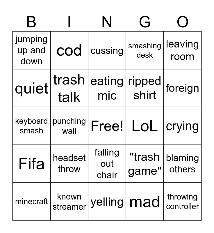This bingo card has a free space and 24 words: headset throw, known streamer, eating mic, minecraft, leaving room, jumping up and down, quiet, cod, LoL, falling out chair, ripped shirt, keyboard smash, "trash game", blaming others, trash talk, mad, crying, cussing, foreign, punching wall, throwing controller, Fifa, smashing desk and yelling.