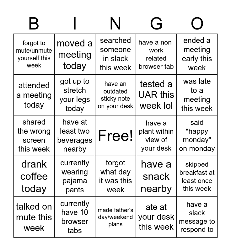 This bingo card has a free space and 24 words: currently wearing pajama pants, currently have 10 browser tabs, have an outdated sticky note on your desk, talked on mute this week, ended a meeting early this week, forgot to mute/unmute yourself this week, attended a meeting today, moved a meeting today, have a plant within view of your desk, forgot what day it was this week, tested a UAR this week lol, shared the wrong screen this week, have a snack nearby, skipped breakfast at least once this week, got up to stretch your legs today, ate at your desk this week, said "happy monday" on monday, searched someone in slack this week, was late to a meeting this week, have at least two beverages nearby, have a slack message to respond to, drank coffee today, have a non-work related browser tab and made father's day/weekend plans.