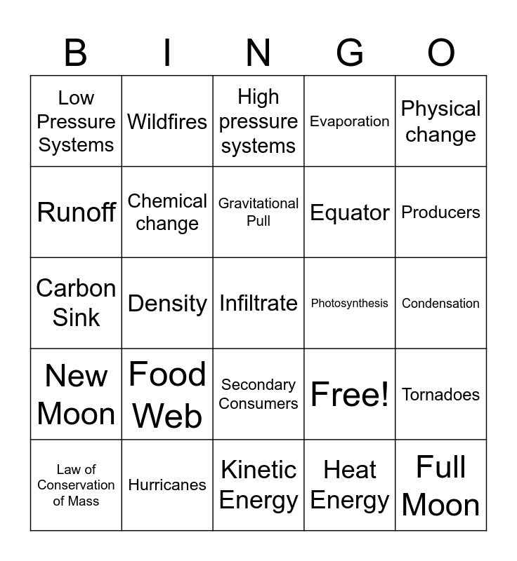 This bingo card has 25 words: Food Web, Kinetic Energy, Gravitational Pull, Law of Conservation of Mass, Physical change, Low Pressure Systems, Runoff, Wildfires, Photosynthesis, Secondary Consumers, Equator, Carbon Sink, Free!, Tornadoes, Chemical change, Full Moon, Condensation, High pressure systems, Producers, Density, Infiltrate, Hurricanes, New Moon, Evaporation and Heat Energy.