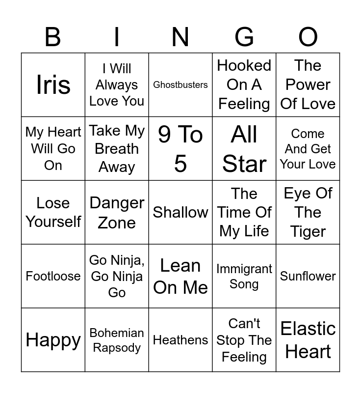 This bingo card has 35 words: Skyfall, I Don't Want To Miss A Thing, Stayin' Alive, Take My Breath Away, Lean On Me, Hooked On A Feeling, My Heart Will Go On, Gangsta Paradise, 9 To 5, Circle Of Life, Lose Yourself, The Power Of Love, Let It Go, Flashdance, Iris, The Time Of My Life, Can't Stop The Feeling, Danger Zone, Footloose, Shallow, Immigrant Song, Happy, Sunflower, Bohemian Rapsody, Ghostbusters, Come And Get Your Love, Elastic Heart, Don't You (Forget About Me), All Star, Eye Of The Tiger, Waterfalls, Heathens, Go Ninja, Go Ninja Go, I Will Always Love You and Men In Black.