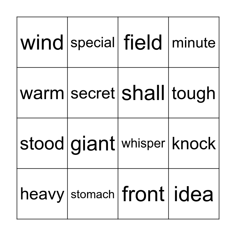 This bingo card has 25 words: straight, whistle, tough, wild, warm, wind, secret, special, stomach, weigh, stood, whisper, second, sign, shall, piece, front, field, giant, knock, heavy, library, idea, minute and quarter.