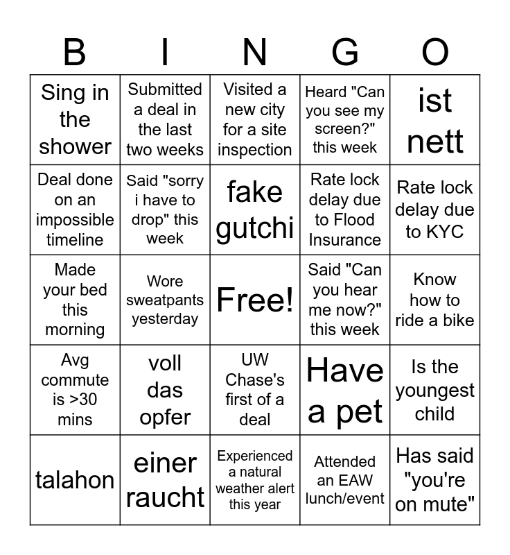 This bingo card has a free space and 24 words: voll das opfer, einer raucht, fake gutchi, talahon, ist nett, Sing in the shower, Deal done on an impossible timeline, Submitted a deal in the last two weeks, Said "Can you hear me now?" this week, UW Chase's first of a deal, Rate lock delay due to Flood Insurance, Made your bed this morning, Have a pet, Is the youngest child, Said "sorry i have to drop" this week, Attended an EAW lunch/event, Know how to ride a bike, Visited a new city for a site inspection, Rate lock delay due to KYC, Wore sweatpants yesterday, Has said "you're on mute", Avg commute is >30 mins, Heard "Can you see my screen?" this week and Experienced a natural weather alert this year.