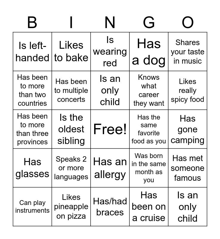 This bingo card has a free space and 24 words: Speaks 2 or more languages, Likes pineapple on pizza, Is an only child, Can play instruments, Shares your taste in music, Is left-handed, Has been to more than two countries, Likes to bake, Has the same favorite food as you, Has an allergy, Knows what career they want, Has been to more than three provinces, Was born in the same month as you, Has met someone famous, Has been to multiple concerts, Has been on a cruise, Has gone camping, Is wearing red, Likes really spicy food, Is the oldest sibling, Is an only child, Has glasses, Has a dog and Has/had braces.