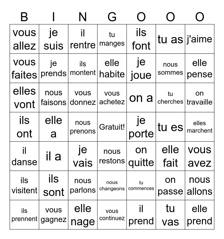 This bingo card has a free space and 55 words: il prend, on travaille, tu fais, vous allez, elle a, ils sont, j'aime, elle est, je prends, nous parlons, tu manges, vous avez, elles marchent, tu es, ils prennent, il danse, ils font, je joue, tu vas, nous sommes, elle pense, il a, on a, il rentre, nous chantons, vous faites, nous prenons, je regarde, elles vont, tu cherches, on arrive, elle fait, nous allons, vous gagnez, tu as, elle habite, ils visitent, nous faisons, elle prend, je vais, je suis, nous changeons, tu commences, tu prends, vous donnez, ils ont, elle nage, on quitte, je porte, ils montent, nous restons, on passe, vous continuez, vous achetez and elle appelle.
