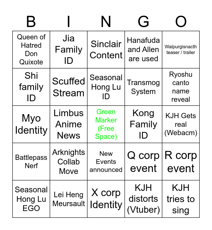 This bingo card has a free space and 24 words: Arknights Collab Move, Lei Heng Meursault, Seasonal Hong Lu ID, Seasonal Hong Lu EGO, Walpurgisnacth teaser / trailer, Queen of Hatred Don Quixote, Shi family ID, Jia Family ID, Kong Family ID, New Events announced, Transmog System, Myo Identity, Q corp event, R corp event, Scuffed Stream, KJH distorts (Vtuber), KJH Gets real (Webacm), Sinclair Content, Ryoshu canto name reveal, Limbus Anime News, KJH tries to sing, Battlepass Nerf, Hanafuda and Allen are used and X corp Identity.