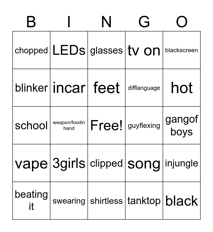 This bingo card has a free space and 24 words: 3girls, swearing, feet, beating it, blackscreen, chopped, blinker, LEDs, guyflexing, clipped, difflanguage, school, song, injungle, incar, tanktop, gangof boys, glasses, hot, weapon/foodin hand, black, vape, tv on and shirtless.