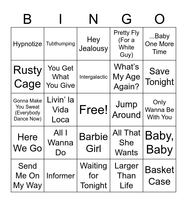 This bingo card has a free space and 60 words: The Sign, Informer, I Just Wanna Be With You, Here We Go, Larger Than Life, It’s Gotta Be You, You Get What You Give, When I Come Around, What’s My Age Again?, Two Princes, Pretty Fly (For a White Guy), One Week, Rusty Cage, Jumpin', Jumpin', Inside Out, Hypnotize, Basket Case, ...Baby One More Time, All Star, Intergalactic, Jump Around, Hey Jealousy, Send Me On My Way, Baby, Baby, Smells Like Teen Spirit, Macarena, C’mon N’ Ride It (The Train), Return of the Mack, Save Tonight, When the Lights Go Out, No Scrubs, Ice Ice Baby, Walking on Broken Glass, Can’t Get Enough Of You Baby, Tubthumping, Believe, Steal My Sunshine, Livin’ la Vida Loca, Life Is A Highway, Gonna Make You Sweat (Everybody Dance Now), MMMBop, All I Wanna Do, Only Wanna Be With You, What Is Love, All That She Wants, The Rhythm of the Night, Another Night, Men In Black, Step by Step, Barbie Girl, Waiting for Tonight, Scatman, Genie in a Bottle, Rhythm Is a Dancer, Show Me Love, Bailamos, I’m Holdin’ On To Love, I Want You, Torn and Everything You Want.
