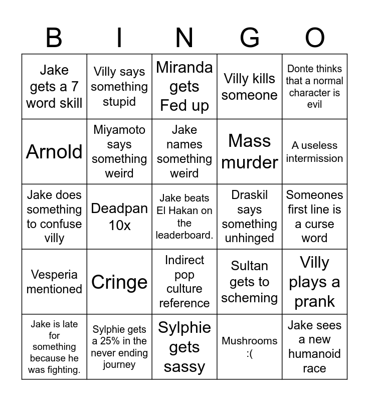This bingo card has a free space and 24 words: Cringe, Sylphie gets a 25% in the never ending journey, Jake names something weird, Jake is late for something because he was fighting., Donte thinks that a normal character is evil, Jake gets a 7 word skill, Arnold, Villy says something stupid, Draskil says something unhinged, Indirect pop culture reference, Mass murder, Jake does something to confuse villy, Sultan gets to scheming, Villy plays a prank, Miyamoto says something weird, Mushrooms :(, Someones first line is a curse word, Miranda gets Fed up, A useless intermission, Deadpan 10x, Jake sees a new humanoid race, Vesperia mentioned, Villy kills someone and Sylphie gets sassy.