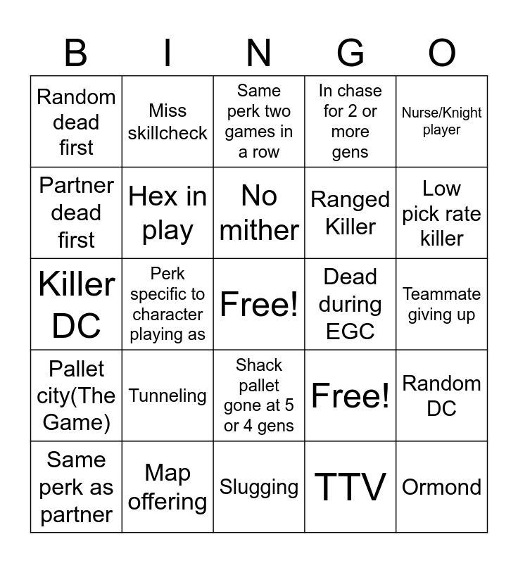 This bingo card has a free space and 25 words: Tunneling, Slugging, No mither, Same perk as partner, Nurse/Knight player, Random dead first, Partner dead first, Miss skillcheck, Dead during EGC, Shack pallet gone at 5 or 4 gens, Ranged Killer, Killer DC, Free!, Random DC, Hex in play, Someone dead on first hook, Teammate giving up, Same perk two games in a row, Low pick rate killer, Perk specific to character playing as, Ormond, Map offering, Pallet city(The Game), In chase for 2 or more gens and TTV.