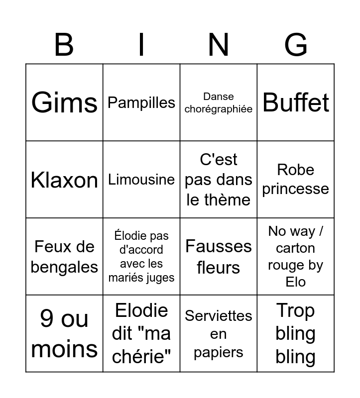 This bingo card has 16 words: Elodie dit "ma chérie", No way / carton rouge by Elo, Danse chorégraphiée, Gims, Feux de bengales, Pampilles, Fausses fleurs, Serviettes en papiers, Klaxon, Limousine, 9 ou moins, Buffet, Élodie pas d'accord avec les mariés juges, Robe princesse, C'est pas dans le thème and Trop bling bling.