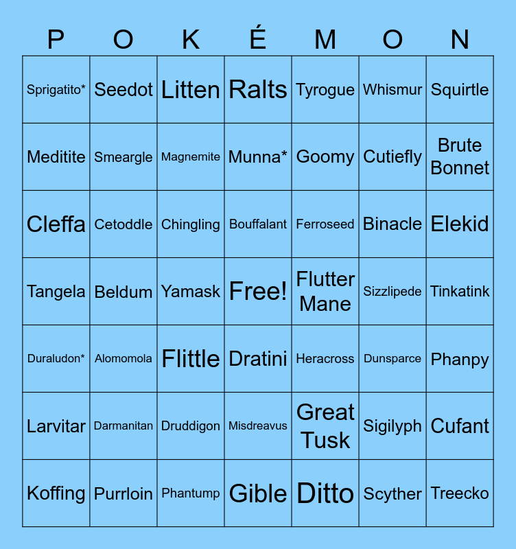This bingo card has a free space and 283 words: Bulbasaur, Charmander, Squirtle, Fuecoco*, Espurr, Quaxly, Honedge, Binacle, Nymble, Skrelp, Pawmi, Impidimp, Tandemaus, Milcery, Ekans, Pichu, Fidough, Hawlucha, NidoranF, NidoranM, Cleffa, Squawkabilly, Carbink, Nacli, Goomy, Vulpix, Charcadet, Klefki, Wattrel, Phantump, Venonat, Maschiff, Pumpkaboo, Meowth, Psyduck, Mankey, Growlithe, Shroodle, Bergmite, Abra, Machop, Toedscool, Noibat, Capsakid, Rowlet, Flittle, Litten, Ponyta, Slowpoke, Magnemite, Farfetch'd, Tinkatink, Popplio, Wiglett, Crabrawler, Grimer, Finizen, Cutiefly, Varoom, Rockruff, Onix, Drowzee, Cyclizar, Mareanie, Voltorb, Exeggcute, Cubone, Tyrogue, Lickitung, Koffing, Ryhorn, Happiny, Tangela, Kangaskhan, Horsea, Orthworm, Mudbray, Glimmet, Dewpider, Mime Jr., Scyther, Smoochum, Elekid, Magby, Pinsir, Tauros, Fomantis, Greavard, Morelull, Lapras, Ditto, Eevee, Porygon, Falinks, Snom*, Stonjourner, Munchlax, Dratini, Chikorita, Cyndaquil, Totodile, Cetoddle, Salandit, Veluza, Stufful, Ledyba, Spinarak, Chinchou, Natu, Tatsugiri, Bounsweet, Azurill, Bonsly, Hoppip, Comfey, Aipom, Yanma, Frigibax, Wimpod, Gimmighoul, Sandygast, Misdreavus, Poltchageist, Pyukumuku, Great Tusk, Komala, Dunsparce, Gligar, Snubbull, Qwilfish, Shuckle, Heracross, Sneasle, Teddiursa, Slugma, Swinub, Corsola, Delibird, Skarmory, Houndour, Phanpy, Stantler, Smeargle, Miltank, Larvitar, Treecko, Torchic, Mudkip, Poochyena, Scream Tail, Turtonator, Lotad, Seedot, Taillow, Brute Bonnet, Togedemaru, Ralts, Surskit, Flutter Mane, Mimikyu, Nincada, Whismur, Makuhita, Nosepass, Slither Wing, Dhelmise, Sableye, Mawile, Iron Bundle, Jangmo-o, Meditite, Plusle, Minun, Volbeat, Illumise, Iron Moth, Grookey, Carvanha, Wailmer, Numel, Torkoal, Spinda, Trapinch, Iron Thorns, Scorbunny, Swablu, Lunatone, Solrock, Sobble, Eiscue, Morpeko, Feebas, Rookidee, Duskull, Tropius, Chingling, Absol, Snorunt, Clamperl, Relicanth, Luvdisc, Beldum, Turtwig, Chimchar, Piplup, Blipbug, Nickit, Gossifleur, Cufant, Duraludon*, Combee, Pachirisu, Buizel, Shellos, Drifloon, Wooloo, Glameow, Stunky, Chatot, Spiritomb, Gible, Riolu, Hippopotas, Skorupi, Croagunk, Carnivine, Snivy, Tepig, Oshawott, Yamper, Lillipup, Purrloin, Munna*, Applin, Roggenrola, Cramorant, Timburr, Arrokuda, Venipede, Cottonee, Petilil, Basculin, Sandile, Darmanitan, Maractus, Sizzlipede, Sigilyph, Yamask, Dreepy, Sprigatito*, Zorua, Gothita, Solosis, Ducklett, Deerling, Emolga, Foongus, Frillish, Alomomola, Joltik, Ferroseed, Klink, Tynamo, Elgyem, Litwick, Axew, Cubchoo, Cryogonal, Druddigon, Golett, Bouffalant, Vullaby, Heatmor, Durant, Deino, Larvesta, Chespin, Fennekin, Froakie, Sinistea, Fletchling, Scatterbug and Litleo.