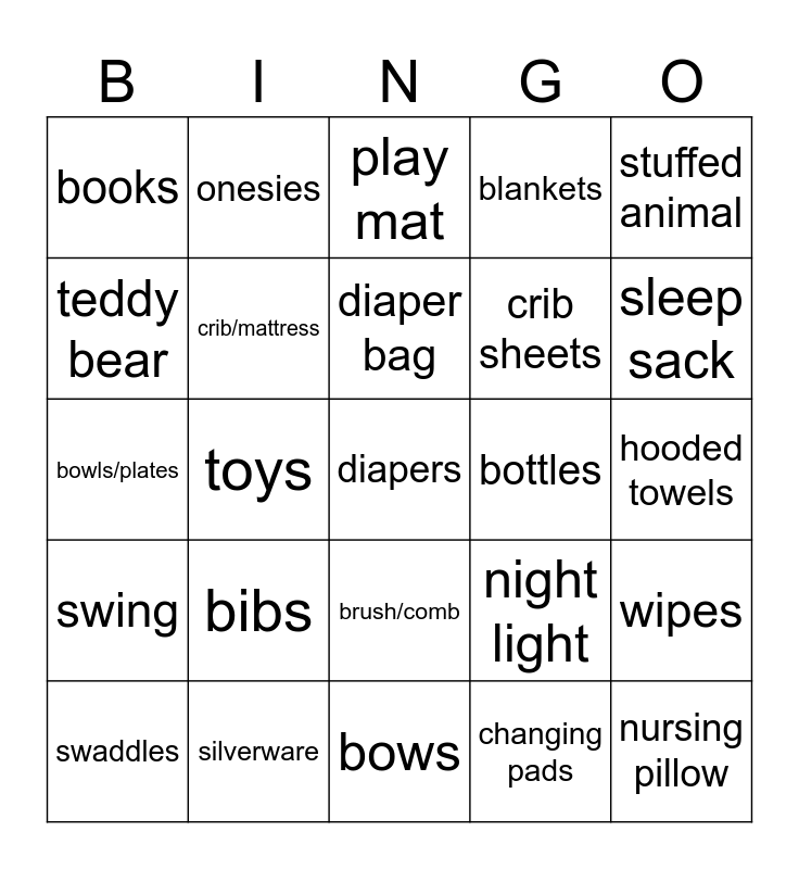 This bingo card has 53 words: Free!, diapers, baby monitor, changing pads, bibs, baby carrier, onesies, socks, teddy bear, baby shampoo, crib/mattress, rubber duck, wipes, night light, burp clothes, swaddles, diaper bag, bottles, bottle drying rack, stuffed animal, toys, nursing pillow, crib sheets, books, humidifier, silverware, lotion, bottle brush, high chair, sleep sack, sippy cup, car seat, grooming set, bath tub, nursing supplies, something PINK, blankets, bows, play mat, shoes, pacifiers, medicine, hooded towels, thermometer, diaper cream, brush/comb, wash clothes, sound machine, bowls/plates, swing, rattle, pajamas and teethers.