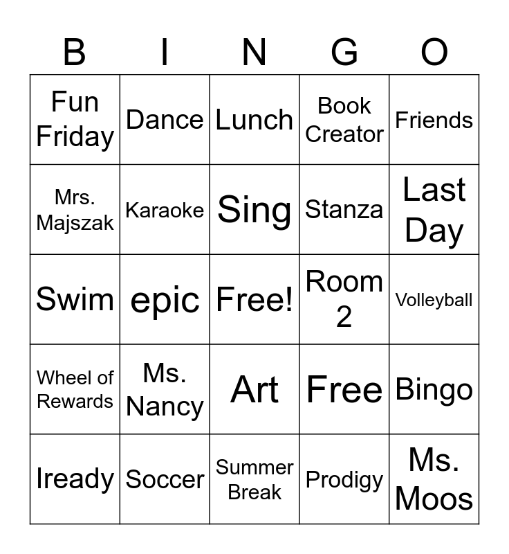 This bingo card has a free space and 25 words: Ms. Nancy, Summer Break, Sing, Iready, Friends, Fun Friday, Mrs. Majszak, Dance, Room 2, Art, Stanza, Swim, Free, Bingo, Karaoke, Google Classroom, Volleyball, Lunch, Last Day, epic, Ms. Moos, Soccer, Wheel of Rewards, Book Creator and Prodigy.