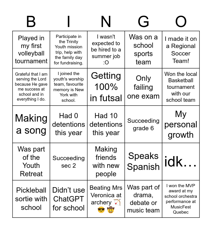 This bingo card has 25 words: Succeeding sec 2, Beating Mrs Veronica at archery 🏹 😎 🤠, Getting 100% in futsal, Pickleball sortie with school, I made it on a Regional Soccer Team!, Played in my first volleyball tournament, Grateful that I am serving the Lord because He gave me success at school and in everything I do., Participate in the Trinity Youth mission trip, help with the family day for fundraising., Succeeding grade 6, Making friends with new people, Only failing one exam, Making a song, Speaks Spanish, idk…, I joined the youth's worship team, favourite memory is New York with school., I won the MVP award at my school orchestra performance at MusicFest Quebec, My personal growth, I wasn't expected to be hired to a summer job :O, Won the local Basketball tournament with our school team, Had 0 detentions this year, Had 10 detentions this year, Didn’t use ChatGPT for school, Was part of the Youth Retreat, Was on a school sports team and Was part of drama, debate or music team.