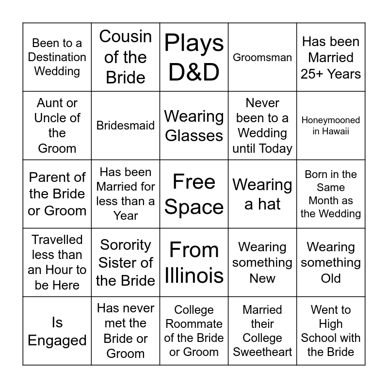 This bingo card has a free space and 49 words: Has a Cat, Went to High School with the Bride, Went to High School with the Groom, College Roommate of the Bride or Groom, Sorority Sister of the Bride, Had a College Class with the Bride or Groom, Cousin of the Bride, Aunt or Uncle of the Bride, Aunt or Uncle of the Groom, Cousin of the Groom, Bridesmaid, Groomsman, Wearing something Old, Wearing something New, Wearing something Borrowed, Wearing something Blue, Wearing Glasses, Wearing a hat, Has been Married 10+ Years, Has been Married 25+ Years, Has been Married for less than a Year, Married their College Sweetheart, Been to a Destination Wedding, Never been to a Wedding until Today, Has a June Wedding Anniversary, Honeymooned in Hawaii, Is Engaged, From Ohio, From Illinois, Travelled less than an Hour to be Here, Travelled by Plane to be Here, Worked with the Bride or Groom, Family Friend of the Bride, Family Friend of the Groom, Has never met the Bride or Groom, Giving a Toast or Speech, Born in the Same Month as the Bride, Born in the Same Month as the Groom, Born in the Same Month as the Wedding, Shares a First or Middle Name with the Bride or Groom, Likes Fishing, Plays an Instrument, Plays Quadball, Sibling of the Bride or Groom, Parent of the Bride or Groom, Plays D&D, Plays Video Games, Only has Brothers and Only has Sisters.