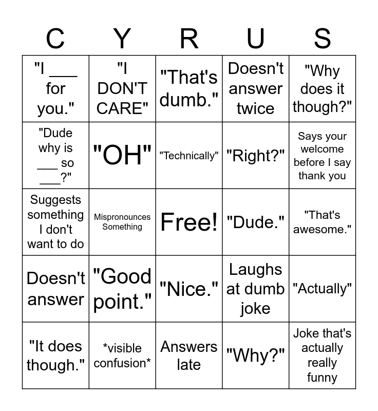 This bingo card has a free space and 24 words: "Good point.", *visible confusion*, "Technically", "It does though.", "Why does it though?", "I ___ for you.", "Dude why is ___ so ___?", "I DON'T CARE", "Dude.", "Nice.", "Right?", Suggests something I don't want to do, Laughs at dumb joke, "Actually", "OH", "Why?", "That's awesome.", "That's dumb.", Says your welcome before I say thank you, Mispronounces Something, Joke that's actually really funny, Doesn't answer, Doesn't answer twice and Answers late.