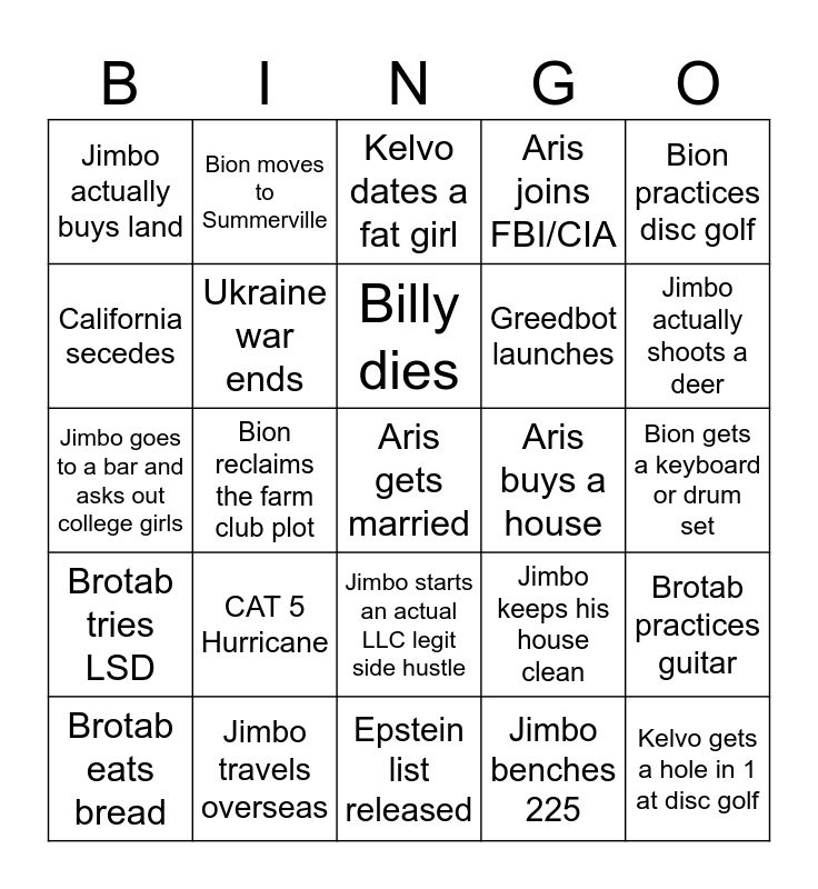 This bingo card has 25 words: CAT 5 Hurricane, Epstein list released, Billy dies, Brotab eats bread, Bion practices disc golf, Jimbo actually buys land, California secedes, Bion moves to Summerville, Aris buys a house, Jimbo starts an actual LLC legit side hustle, Greedbot launches, Jimbo goes to a bar and asks out college girls, Jimbo keeps his house clean, Brotab practices guitar, Ukraine war ends, Kelvo gets a hole in 1 at disc golf, Bion gets a keyboard or drum set, Kelvo dates a fat girl, Jimbo actually shoots a deer, Bion reclaims the farm club plot, Aris gets married, Jimbo travels overseas, Brotab tries LSD, Aris joins FBI/CIA and Jimbo benches 225.
