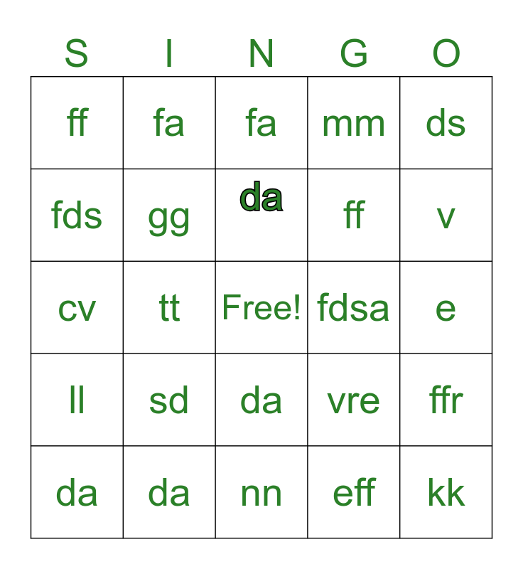 This bingo card has a free space and 24 words: sd, da, da, da, ds, ff, fds, fa, fdsa, da, ff, cv, vre, ffr, gg, eff, e, fa, v, tt, kk, ll, mm and nn.