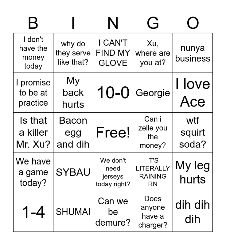 This bingo card has a free space and 24 words: SYBAU, SHUMAI, 10-0, 1-4, nunya business, I don't have the money today, I promise to be at practice, why do they serve like that?, Can i zelle you the money?, We don't need jerseys today right?, Georgie, Is that a killer Mr. Xu?, IT'S LITERALLY RAINING RN, My leg hurts, My back hurts, Does anyone have a charger?, wtf squirt soda?, I CAN'T FIND MY GLOVE, I love Ace, Bacon egg and dih, dih dih dih, We have a game today?, Xu, where are you at? and Can we be demure?.